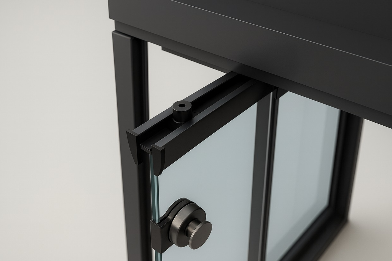Las hojas de vidrio templado se deslizan suavemente sobre guías de aluminio anodizado y pueden girar completamente hacia el interior, ofreciendo apertura total del espacio, una ventilación óptima y fácil mantenimiento.