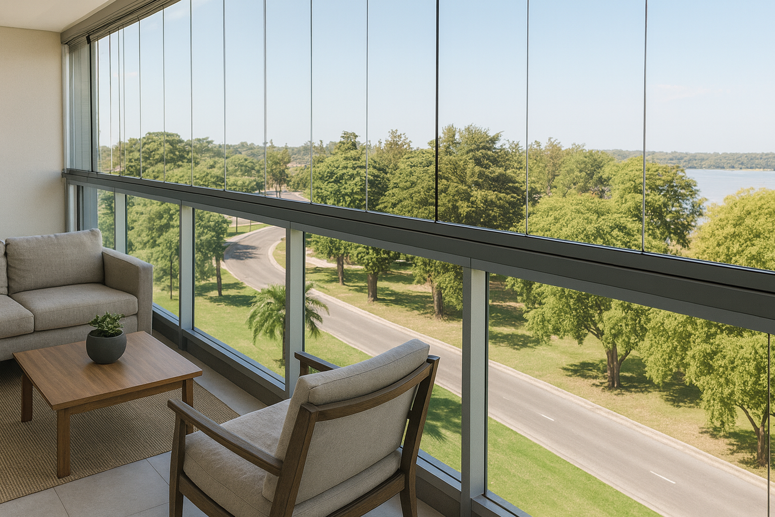 Nuestros sistemas —ya sea para interiores o para balcones y galerías— se destacan por sus líneas limpias sin perfiles verticales, movimiento suave, mínima necesidad de mantenimiento y un acabado sofisticado que realza cada ambiente.